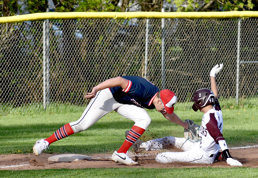 OBSERVER Photo by Matt Spielman Southwestern third baseman Oscar Harris tags out Dunkirk’s Jaryel Vazquez attempting to steal during Chautauqua-Cattaraugus Athletic Association Division 1 baseball action at Packard Field on Friday in Lakewood.