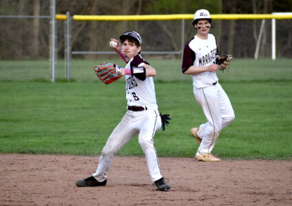 OBSERVER Photo by Matt Spielman Dunkirk’s Aries Cheverez makes a throw to first base as teammate Josh Lemanski backs up in the infield against Southwestern during Chautauqua-Cattaraugus Athletic Association Division 1 baseball action at Packard Field on Friday.