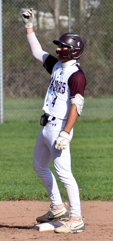 - OBSERVER Photo by Matt Spielman Dunkirk’s Anthony Piede celebrates an RBI double against Southwestern in CCAA Division 1 baseball action at Packard Field on Friday.