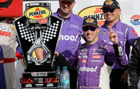 LAS VEGAS (AP) — Denny Hamlin returned to victory lane at Las Vegas Motor Speedway on Sunday for his first win since he lost the NASCAR championship four months ago, and first since the death of his father in a December house fire.
