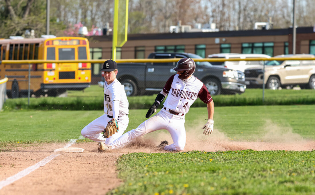 - OBSERVER Photo by Jon Neubauer Dunkirk’s Anthony Piede attempts to slide under the tag of Silver Creek/Forestville third baseman Damon Bell.